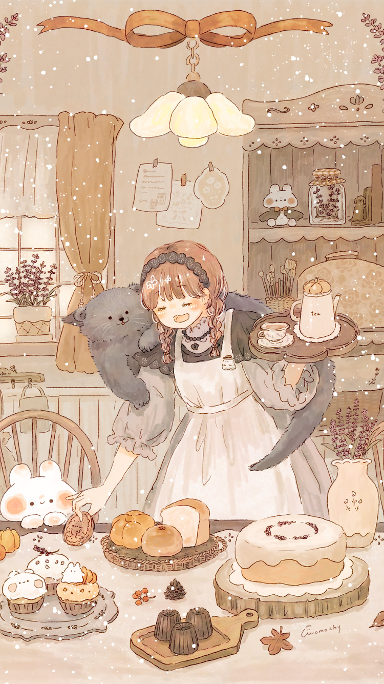 アメジストセージとビントロング、ハロウィンのお茶会をしている女の子のイラストのロック画面です。