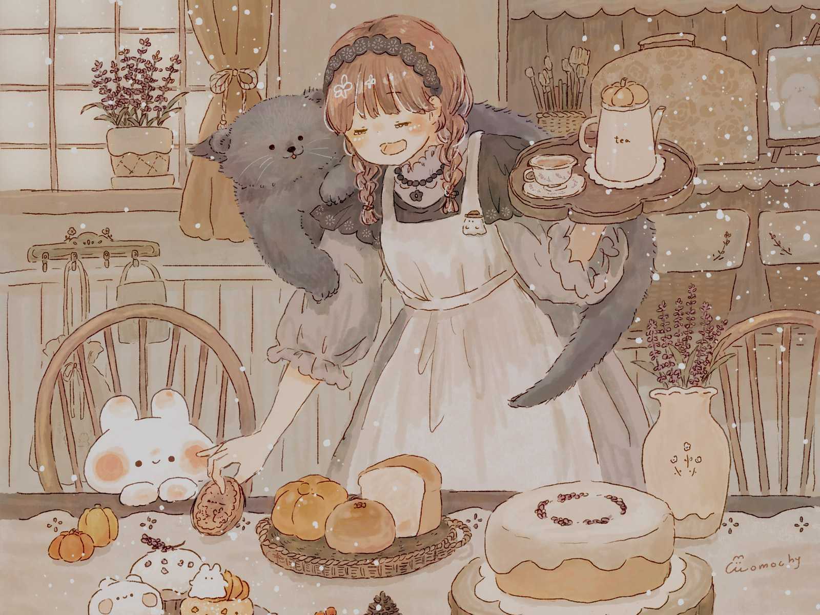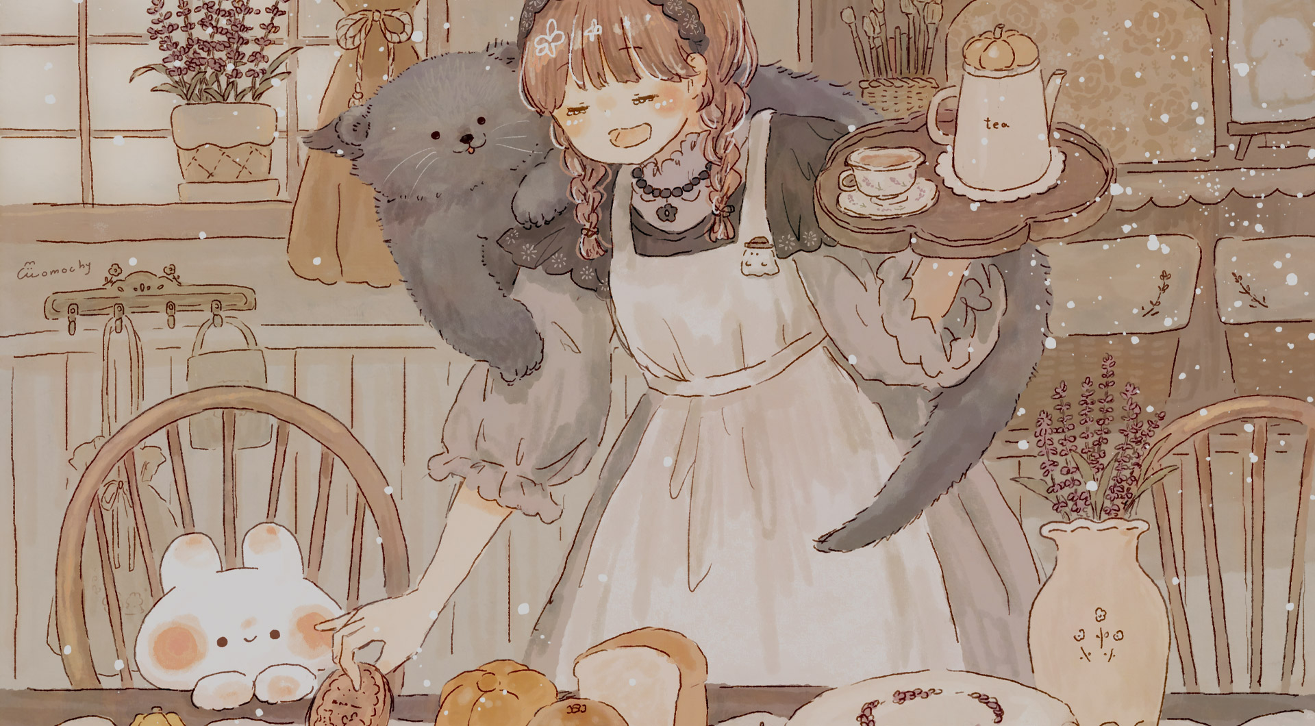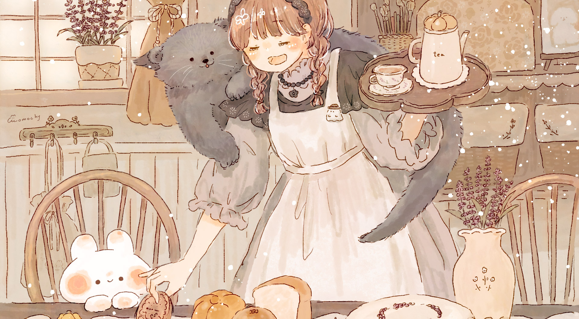 アメジストセージとビントロング、ハロウィンのお茶会をしている女の子のイラストのデスクトップ壁紙です。