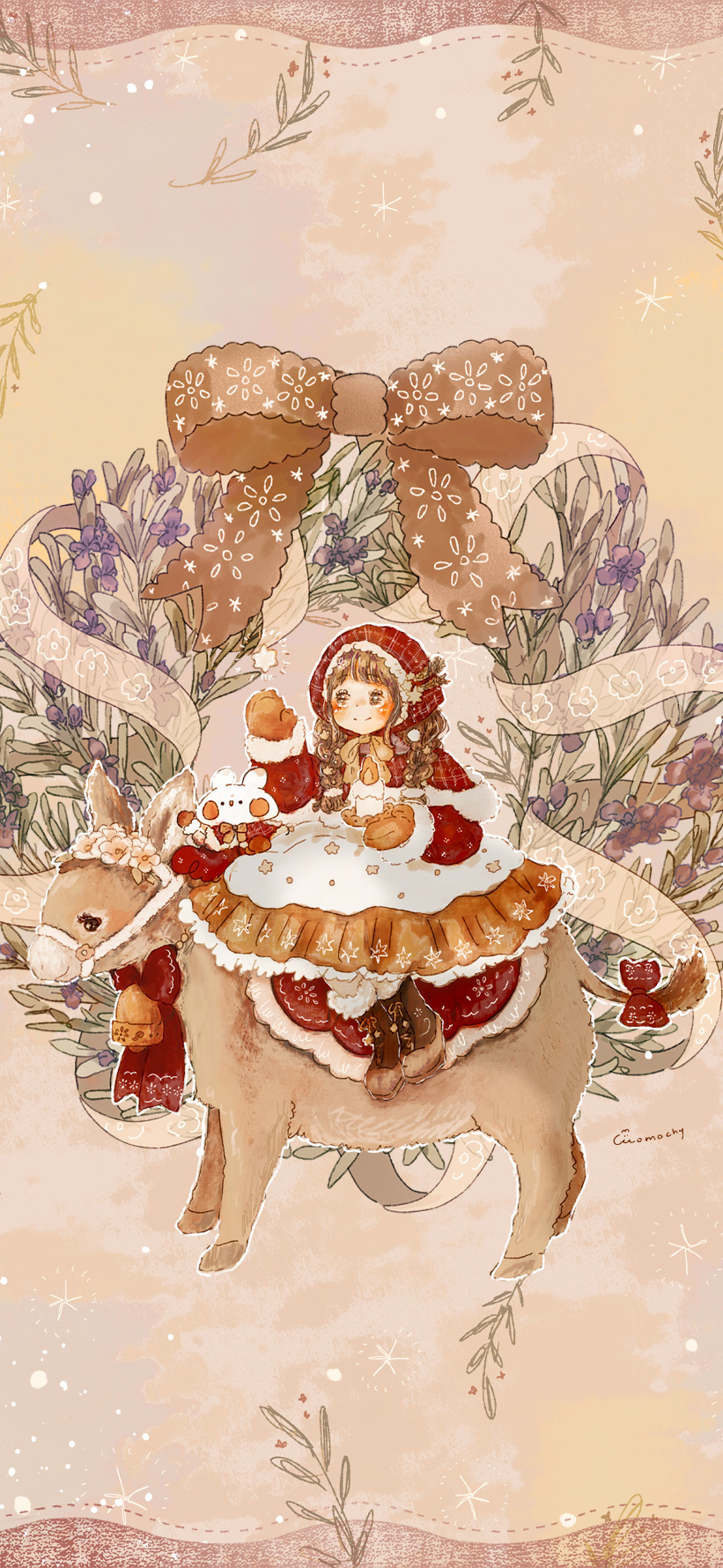 ロバとローズマリーと女の子を描いたイラストのロック画面です。
