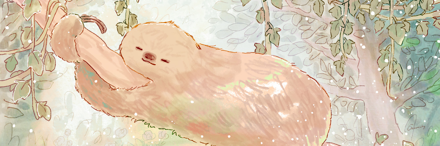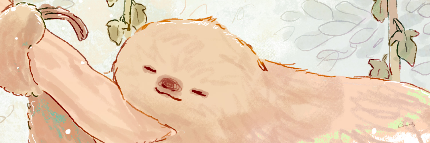 ラナンキュラスとフタユビナマケモノと女の子を描いたイラストのフリーヘッダーです。