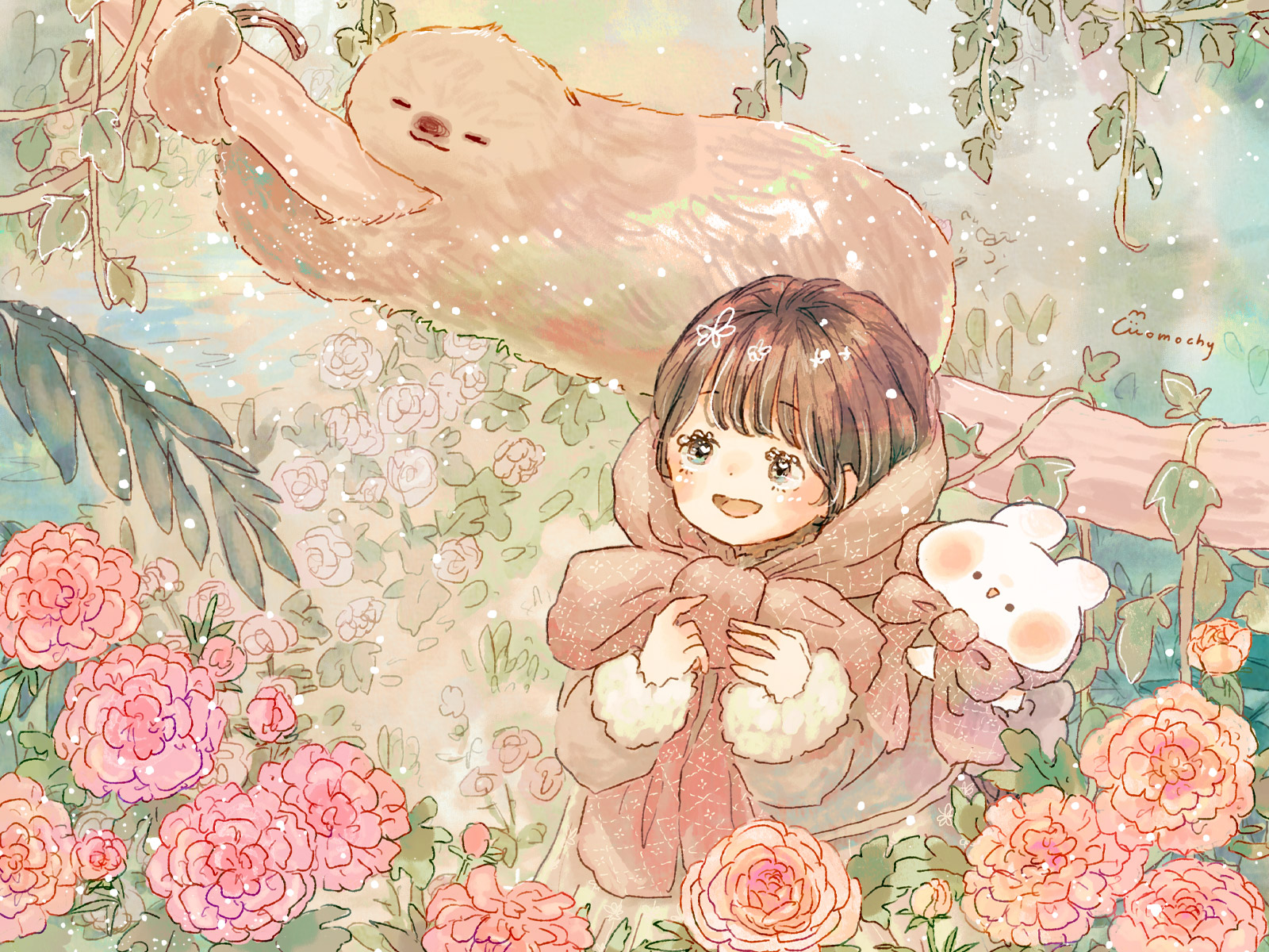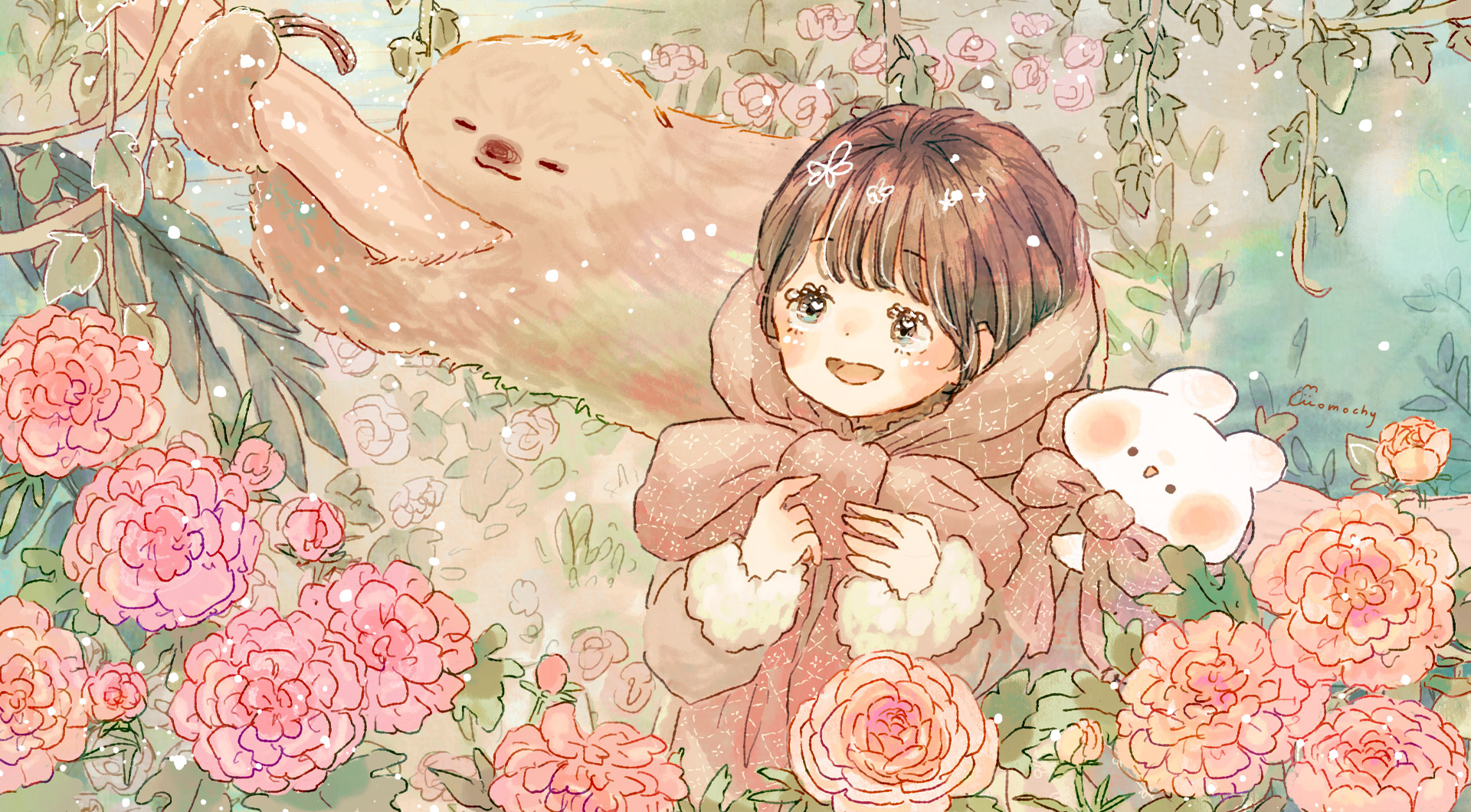 ラナンキュラスとフタユビナマケモノと女の子を描いたイラストのデスクトップ壁紙です。