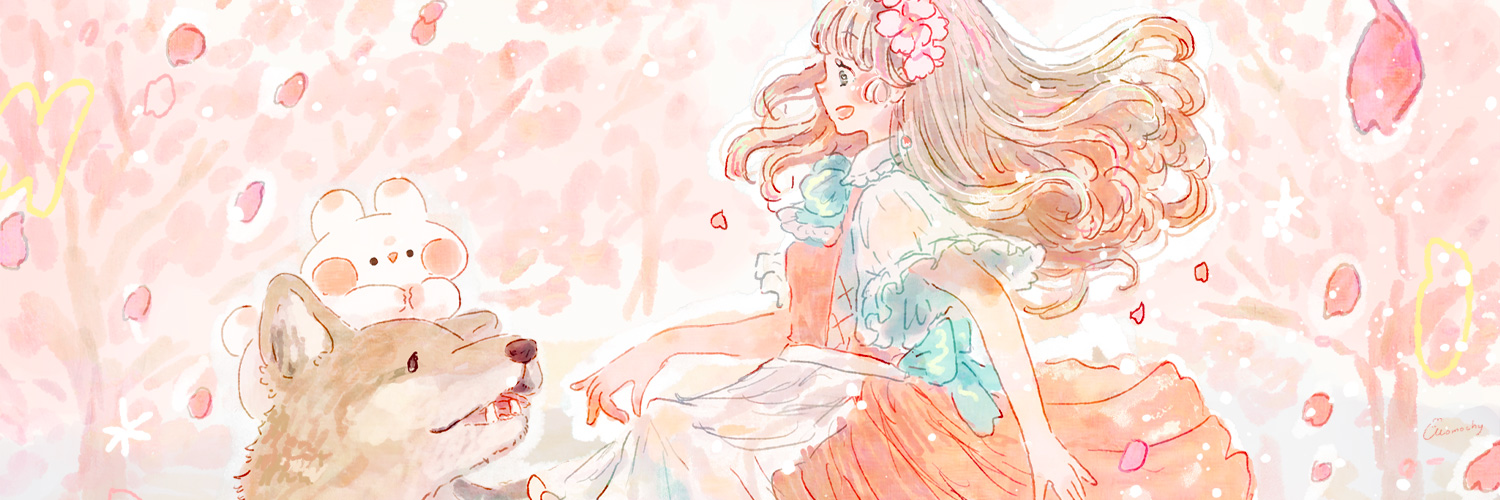 河津桜とオオカミと女の子を描いたイラストのフリーヘッダーです。