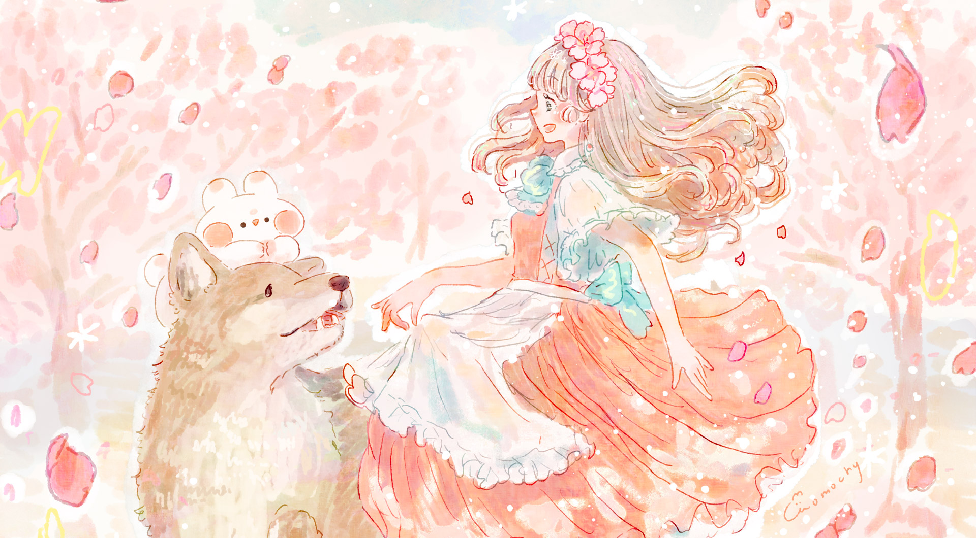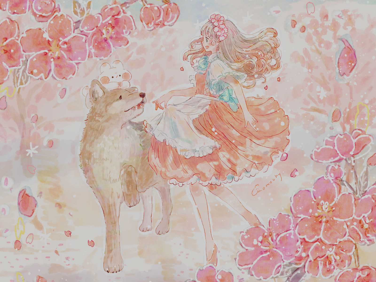 河津桜とオオカミと女の子を描いたイラストのデスクトップ壁紙です。