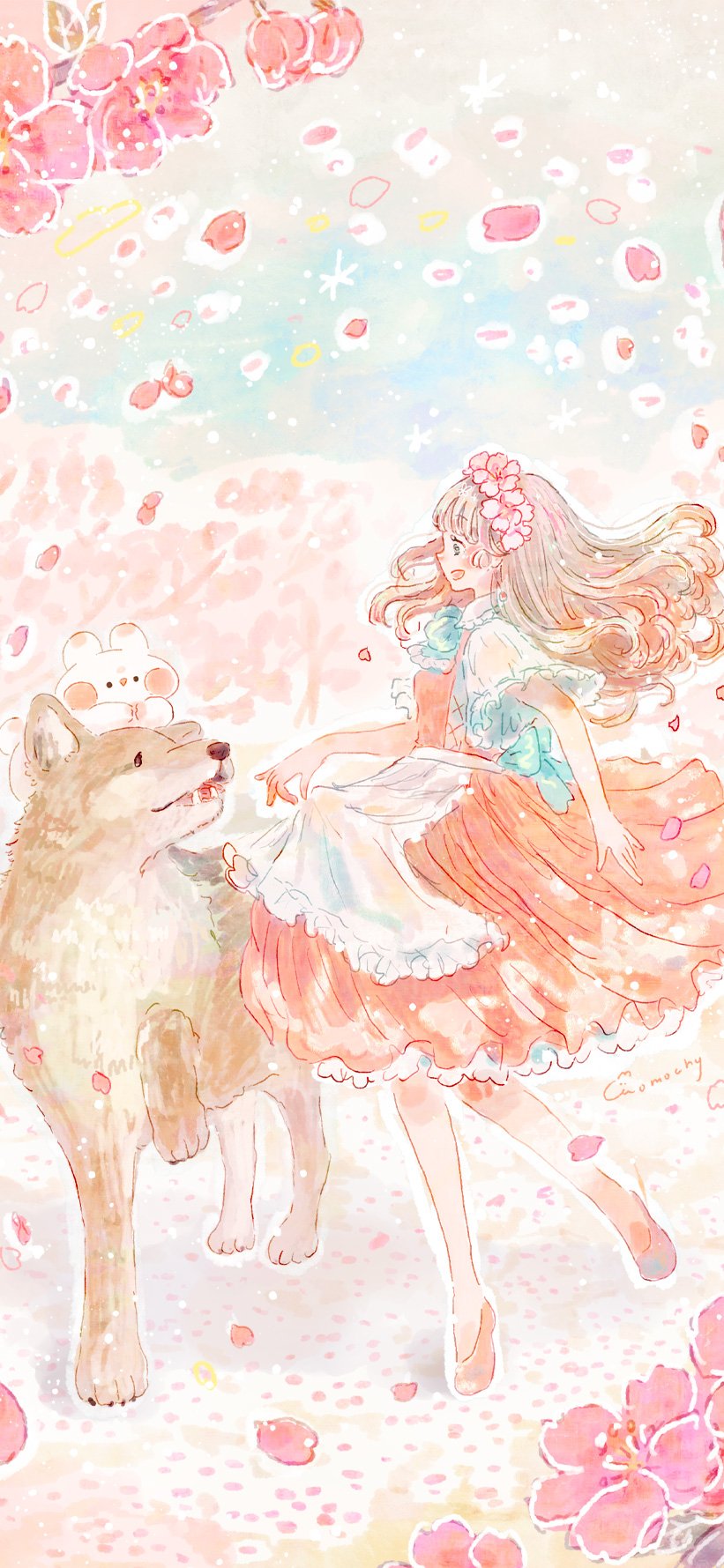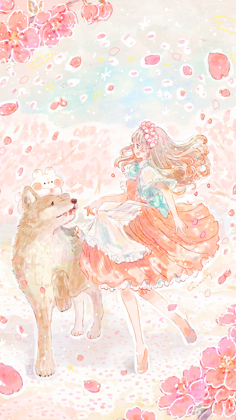 河津桜とオオカミと女の子を描いたイラストのロック画面です。